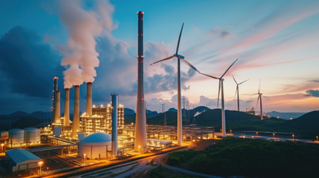 A dynamic showcase of renewable energy features wind turbines, power plants, and eco-friendly designs.
