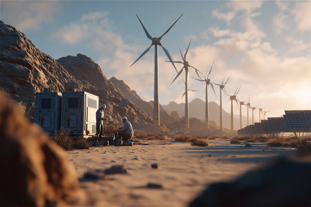 Solar panels and wind turbines generating renewable energy for green and sustainable future.