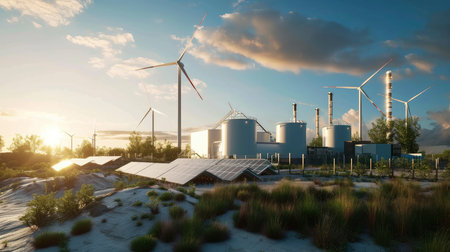 A vast renewable energy complex featuring sleek buildings, wind turbines, and solar panels, with a dynamic urban backdrop. The atmosphere reflects technological progress and sustainability.