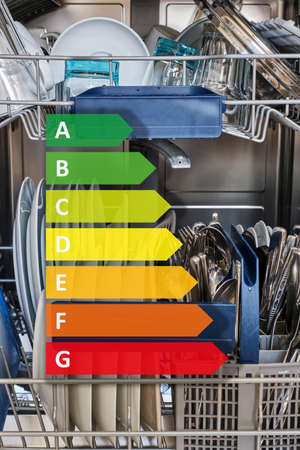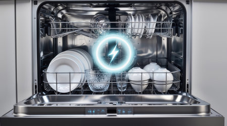 Open dishwasher showing energy efficiency with electricity symbol, concept of saving energy