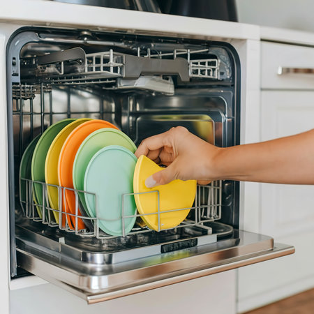 A sleek and modern dishwasher with an open door reveals sparkling clean dishes and utensils, showcasing effective design for optimal kitchen organization and efficiency.