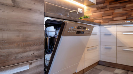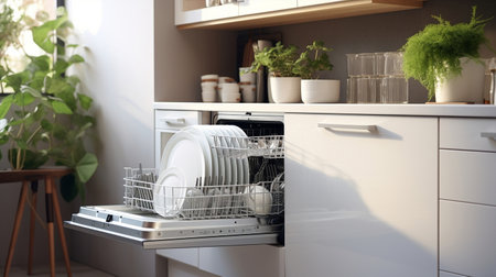 Modern kitchen dishwasher with white dishes for electronic washing device in stylish setting