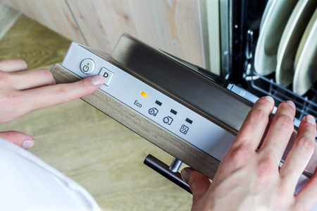 Run the dishwasher machine. Close-up of woman's finger pressing start button on dishwasher in the kitchen.