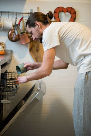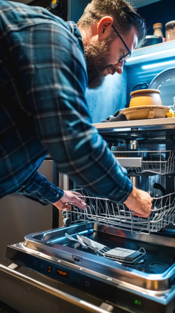A man carefully fills the dishwasher with dirty dishes, organizing them neatly to ensure a thorough clean
