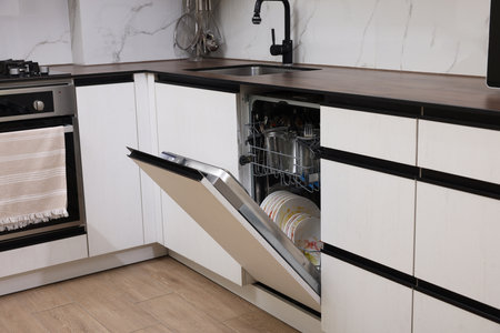 Open door of built-in dishwasher with clean plates and dishes at kitchen. Housework