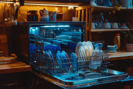 A modern dishwasher filled with neatly arranged clean dishes and silverware shines under bright lights in a stylish kitchen. Ideal for images showcasing convenience and home efficiency.