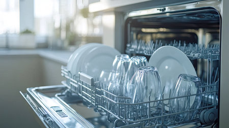 Modern dishwasher with clean glasses and tableware inside. Efficient household appliance for easy dishwashing, ensuring hygiene and convenience. Eco-friendly technology saving time, water, and energy in the kitchen.