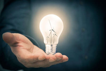 hand with light bulb and windmills, concept of renewable energies