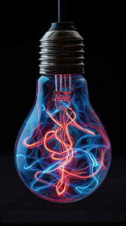 A stylized light bulb filled with red and blue energy patterns is presented against a black backdrop. The vibrant colors and dynamic lines create a sense of electricity and technology. This image could be useful for conceptual projects related to innovation and ideas.