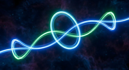 An abstract digital art image of intertwining blue and green neon light trails forming a flowing, looping pattern. The glowing lines move through a dark background depicting a starry nebula in outer space. The image conveys concepts of energy, speed, technology, and cosmic phenomena.