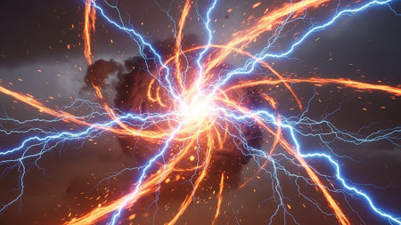 Vibrant lightning arcs create dynamic patterns against a dark backdrop