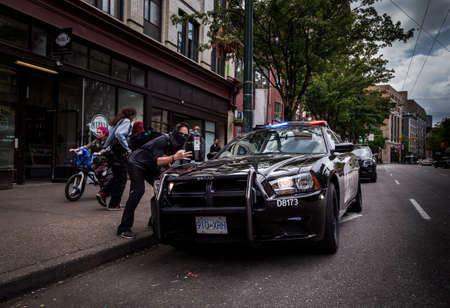 EAST VANCOUVER, BC, CANADA - MAY 11, 2016: Man with a bandanna covering his face shows the hand-sign for East Vancouver in front of VPD cruiser.