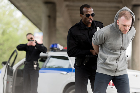 angry african american policeman arresting young man while female partner covering him with handgun