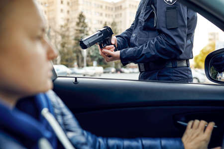 Male police officer with gun arrests female driver