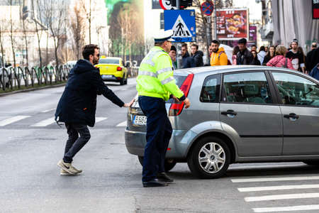 Police agent, Romanian Traffic Police (Politia Rutiera) directing traffic during rush hour in downtown Bucharest, Romania, 2021
