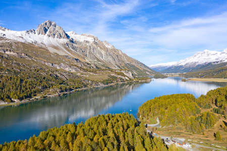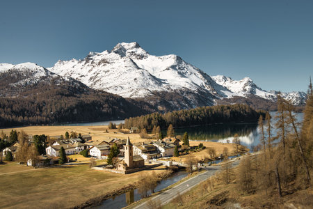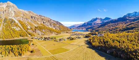 Stunning view of Sils lake and the swiss alps in Upper Engadine including Piz Corvatsch with golden trees in autumn and aerial view of the village Sils-Maria, Canton of Grisons, Switzerland.