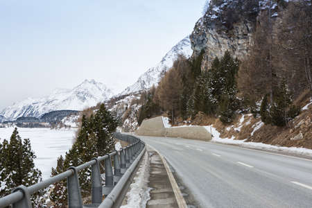 Mountain road in Swiss alps at overcast winter day. Val Bregaglia, canton Graubunden, Switzerland.