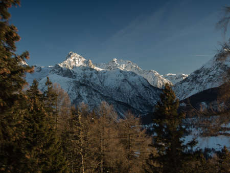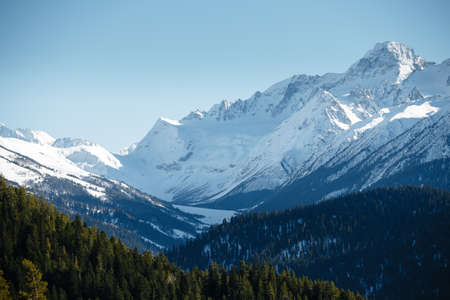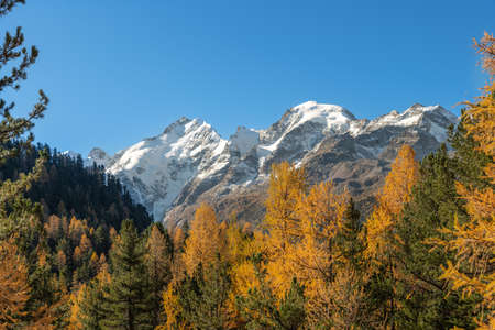 Stunning view of the peak Ela of swiss Alps with colorful trees in autumn, Canton of Grisons, Switzerland