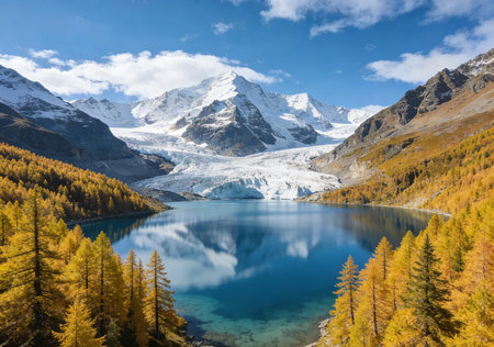 Beautiful autumn alpine landscape with mountain lake and snowcapped peaks in Swiss Alps