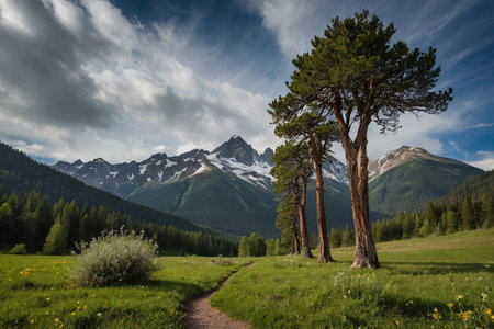 Pine forest in the mountain valley. Beautiful view of the mountain range.