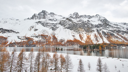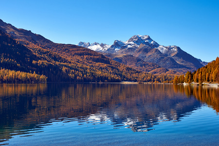 Autumn landscape in the Engadine, a beautiful area of Switzerland, with a snowy mountain in the background, yellow larch trees and an awesome lake in the foreground.