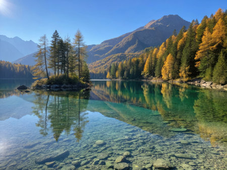 Stunning view of the Palpuogna lake near Albula pass with golden larch in autumn, Canton of Grisons, Switzerland