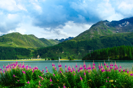 View over a meadow with flowers and Silvaplanersee along Swiss Engadin