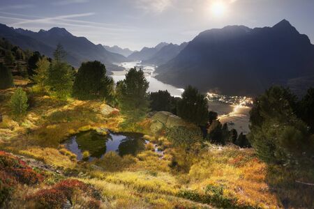 Silvaplana in Switzerland is a beautiful chain of reservoirs surrounded by picturesque rocky peaks. High-altitude lake Hahnensee in the starlight under the moon