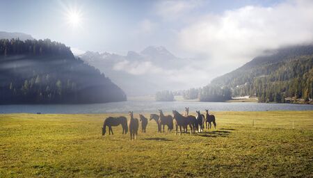 Silvaplana in Switzerland is a beautiful chain of lakes surrounded by picturesque rocky peaks. Cows, sheep and horses - beautiful stallions and mares graze on pastures in the valleys.
