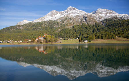 Mountain lake panorama with mountains reflection. Idyllic look. Autumn forest. Silvaplana Lake, Switzerland