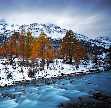 Autumn landscape in the Swiss Alps in Pontresina near Saint Moritz with beautiful yellow larches and a stream