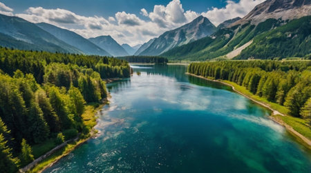 Aerial view of the mountain lake and forest. Beautiful summer landscape.