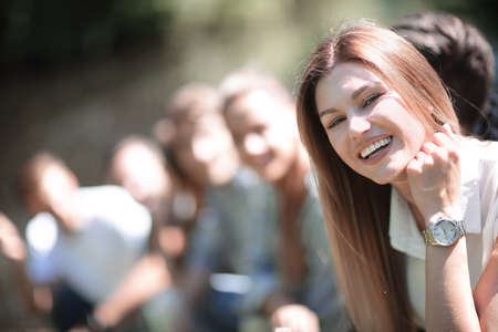 Happy young group of friends hanging out together at the park