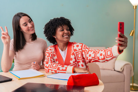 African American and Caucasian students taking selfie while studying at home