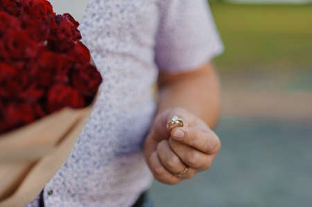 Bouquet of red roses, womens gold ring with a stone. Bouquet of red flowers. An offer of marriage