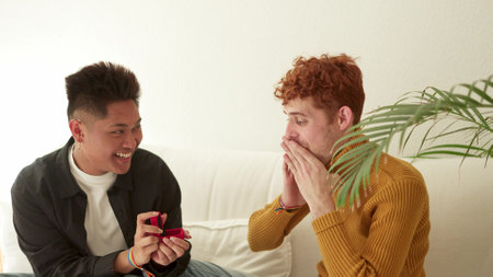 Gay man proposing to his partner at home