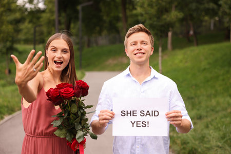 Smiling man holding sheet of paper with text She Said Yes and his excited beloved with bouquet of roses showing ring on engagement day outdoors