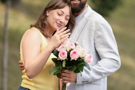 Pleasant moment of engagement. Cropped image of man putting on engagement ring on his wife finger while standing outdoors. Marriage proposal concept. Man and woman engaged. Romance of couple in love.