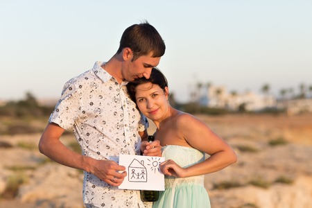 Portrait of happy young couple showing house drawn on paper outdoors.