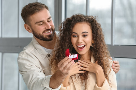 Couple with a diamond ring in jewelry shop