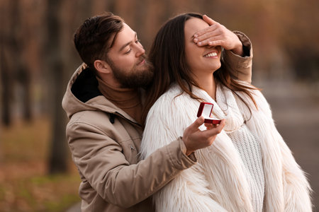 Young man with engagement ring closing her girlfriend's eyes in park