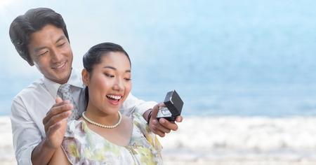 Digital composite of Man proposing to woman against blurry beach