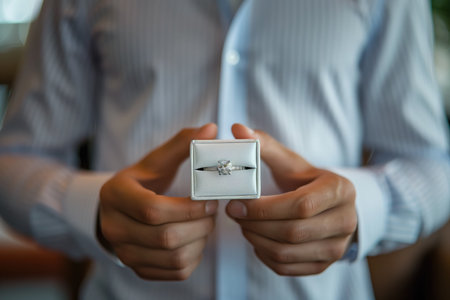 Close up photo of man holding box with wedding ring