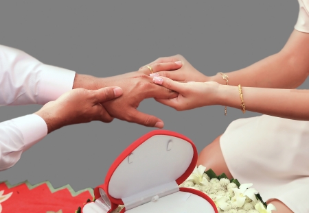woman hand ring with man hand on gray background