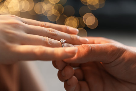 Making marriage proposal. Man putting engagement ring on his girlfriend's finger against blurred background, closeup. Bokeh effect