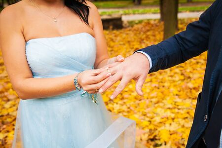 hands of the newlyweds with gold wedding rings against the background of an artificial waterfall, the groom puts the ring on the girl's finger. High quality photo