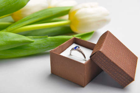 Beautiful ring and flowers on light background. International Women's Day celebration