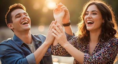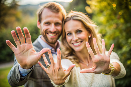 Engaged couple holding their hands up to the camera, displaying their wedding rings with a lighthearted and joyful expression. Generative ai