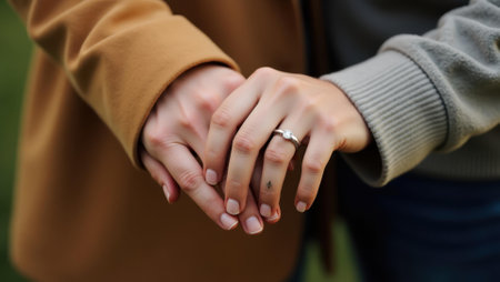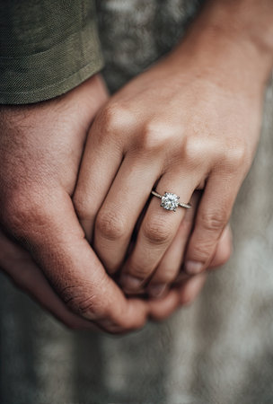 An intimate close-up showcases two hands clasped together, one adorned with a sparkling ring. The lighting appears soft and diffused, highlighting textures of the skin. This image suggests themes of commitment and relationships, suitable for various editorial and commercial applications. The composition draws focus to the ring as the central subject.