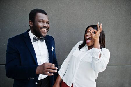 Stylish african american couple in formal wear. Romantic couple in love dating. They show ok fingers.